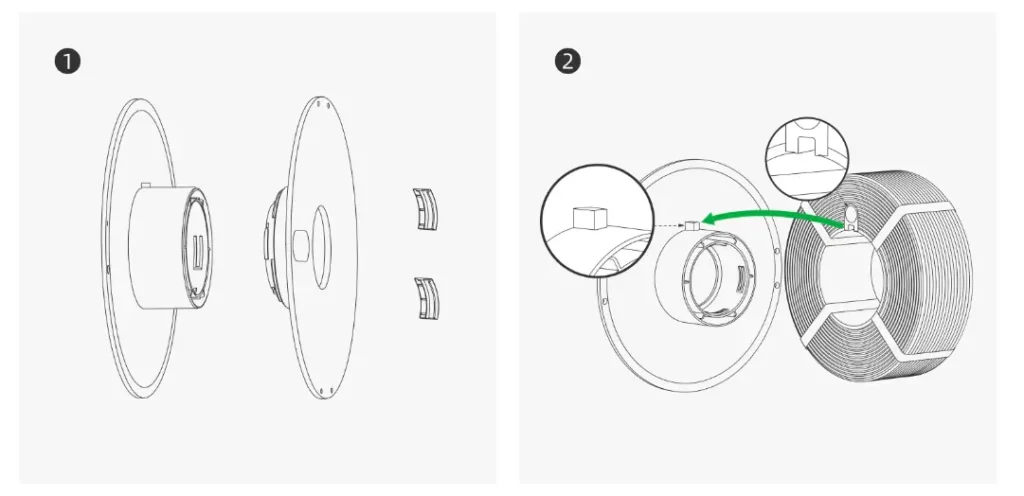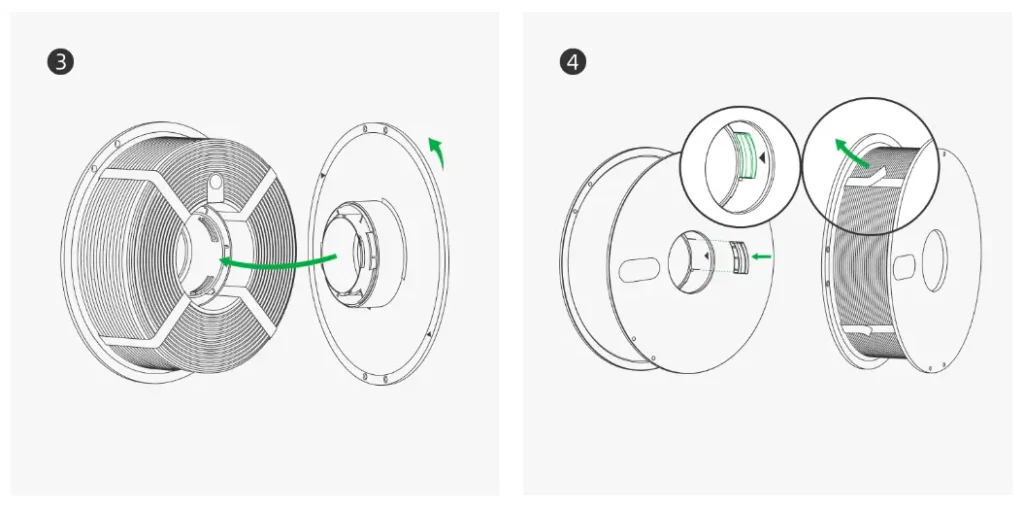 2)Find the locator (a tiny block on the wide piece). Align it with the notch on the inner ring of the filament roll. Insert the wide piece into the filament roll.