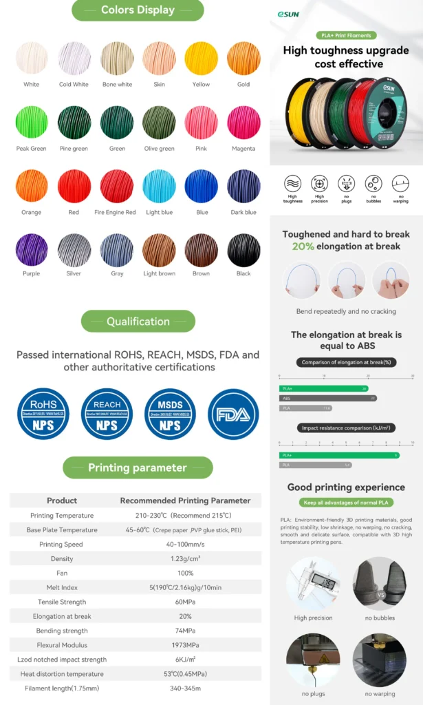 PLA+ is an eco-friendly material with a smooth surface that prints easily. Due to its excellent strength, stiffness, toughness balance, and robust impact resistance, PLA+ filament is recommended for the printing of functional parts. The FDA has approved eSUN PLA+, making it safer to use. It can be used for rapid prototyping and modeling.